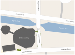 The assembly point is outside the main entrance on Haggerston road, by the bridge and evacuation routes are given below.