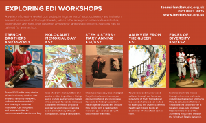 HMDT Music’s award-winning projects for schools include commissions of new works for students to perform, which usually focus on celebrating those whose voices are rarely heard, supported by arts-embedded cross-curricular resources and workshops. It also offers CPD for teachers to support using the arts to enhance the curriculum, a range of bespoke creative projects and a wealth of resources and activities for commemorating Remembrance Day, Holocaust Memorial Day and Black History Month.